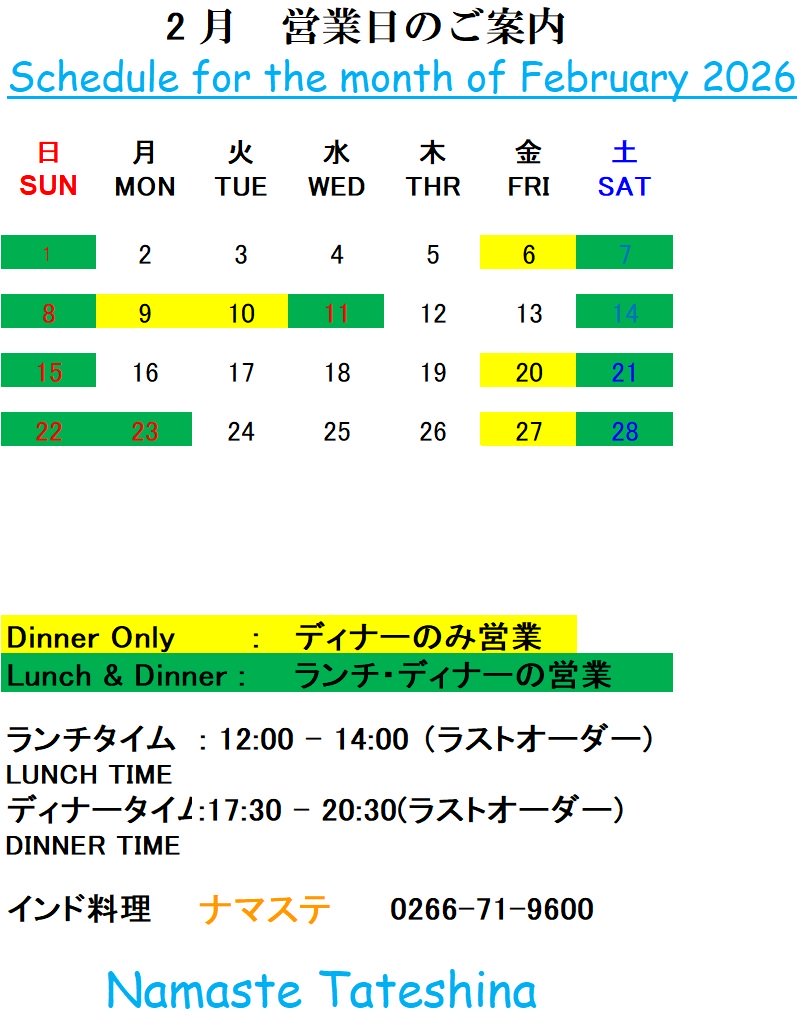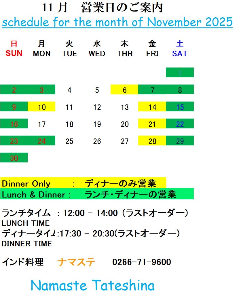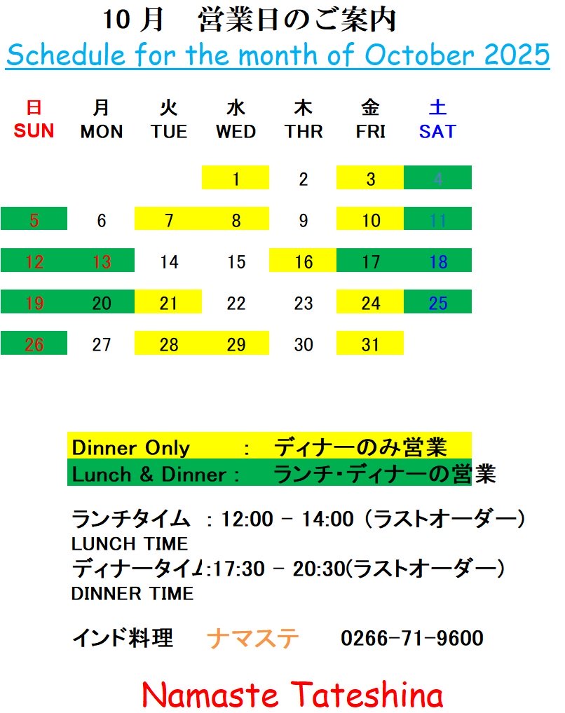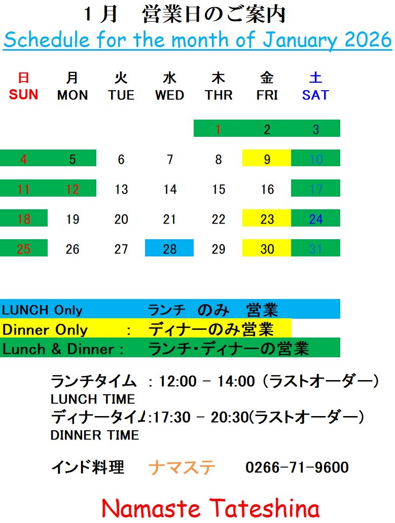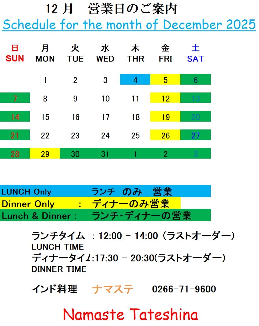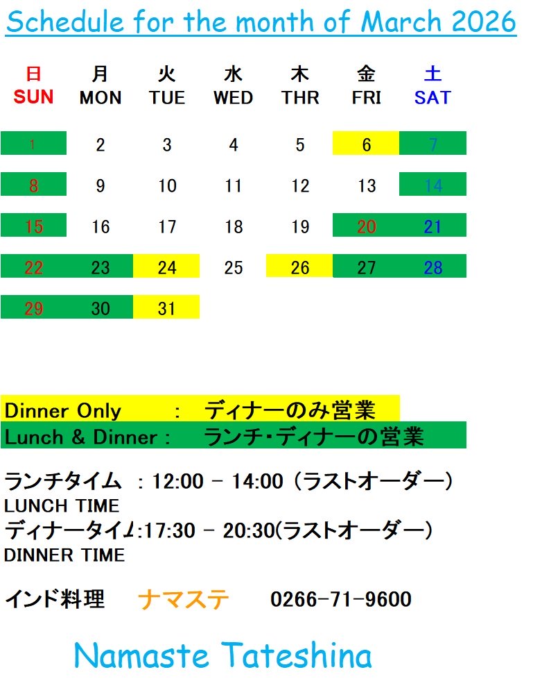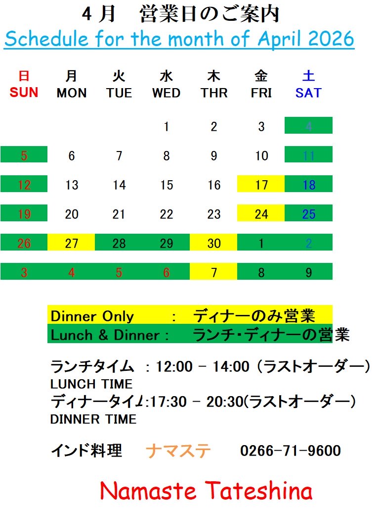 Since Namaste Tateshina is an seasonal location, the schedule for